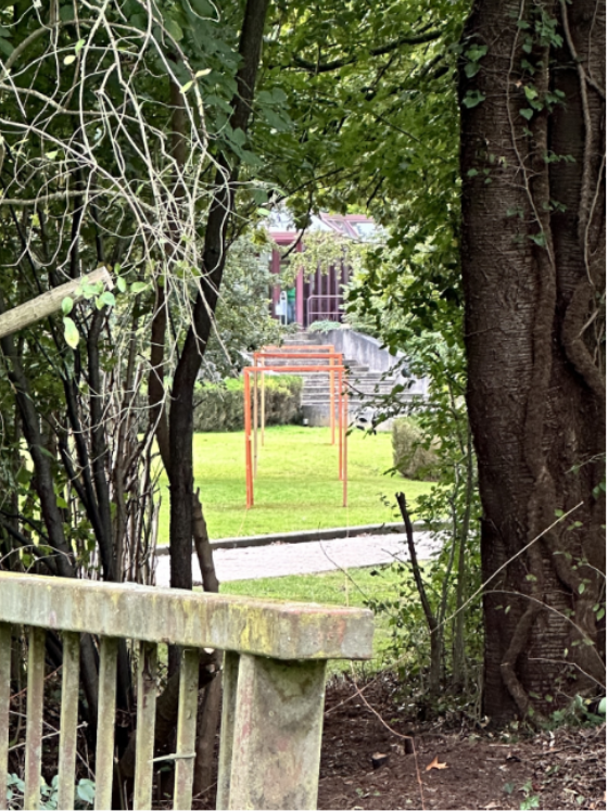 Momenteel is de ingang van de faculteit Architectuur niet makkelijk te vinden. Ook in de toekomst zal het niet zo eenvoudig zijn. Volgens het masterplan van POM eindigt het platform dat de bustramhalte met onze faculteit verbindt op de brandweg. Wij willen de ingang vanaf het platform al zichtbaar maken. Dit doen we door een zichtlijn te creëren vanaf het einde van het platform naar de trappen van de hoofdingang. Aan de fysieke zichtlijn zijn positieve kwaliteiten van de omgeving in de kijker gezet en negatieve kwaliteiten verborgen. De oranje kleur die ons statement duidelijk maakt is ook een verwijzing naar de faculteit.